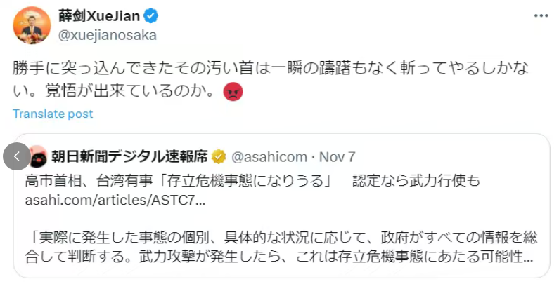 蔡亮認為,日本方面這次想要探討的第三個問題性質更為惡劣,就是日本外相重提中國駐大阪總領事薛劍相關言論,將薛劍總領事的正常表述惡意解讀,還狡猾地提出「中國方面要做妥善處理機制」暗指要中國召回大使。「這種要求完全就是胡扯。」
